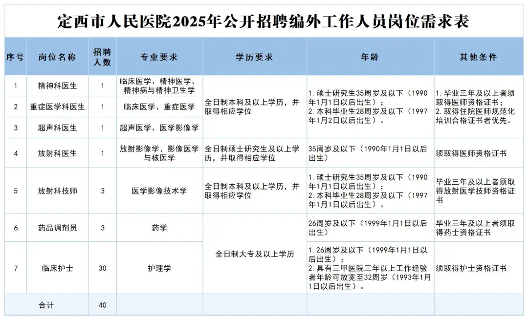 原始标题:定西市人民医院2025年公开招聘编外工作人员公告