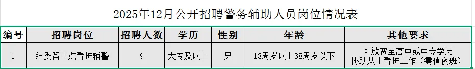 本次计划招聘9名警务辅助人员(以下简称“辅警”),具体岗位要求详见附件《2025年12月公开招聘警务辅助人员岗位情况表》。岗位具体工作地点、内容、时间视实际工作需要而定,辅警须服从县局分配。