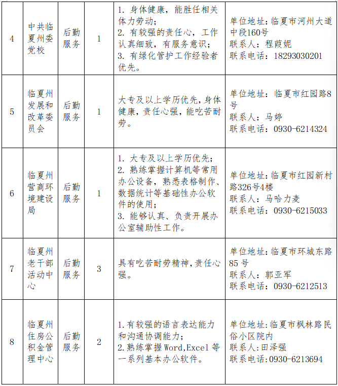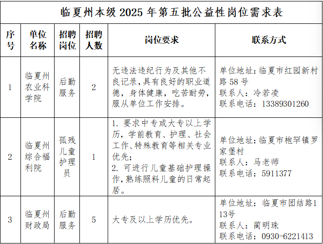 3.联系人:各机关事业单位联系人(详见临夏州本级2025年第五批公益性岗位需求表)