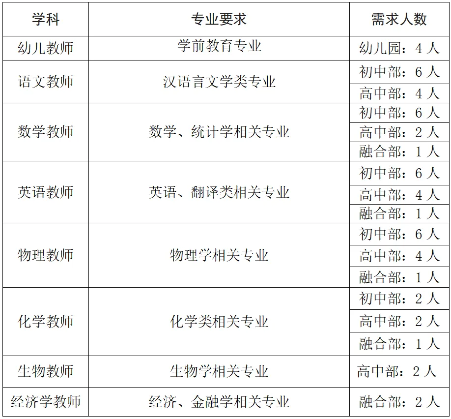 1.应聘初\高中教师需具有本学科一轮以上的教学经历,有较强的教育教学改革意识和能力,教学业绩突出,特别优秀者年龄可适当放宽。