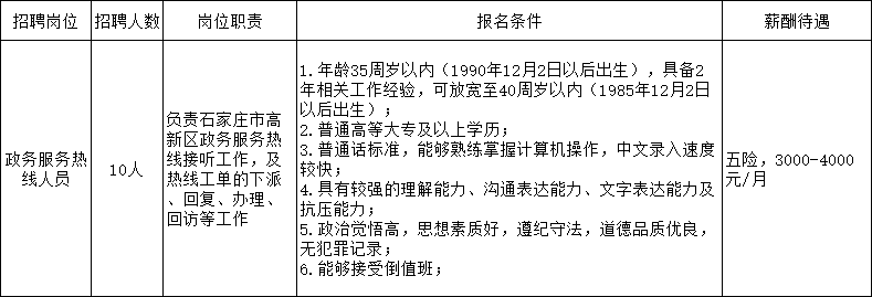 根据石家庄高新技术产业开发区政务服务热线工作需要,面向社会公开招聘10名政务服务热线人员。现将有关事项公告如下: