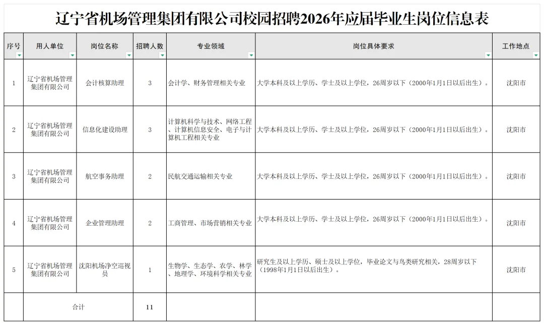 本次招聘5个岗位,共11人,具体是:会计核算助理3人、信息化建设助理3人、航空事务助理2人、企业管理助理2人、沈阳机场净空巡视员1人。招聘岗位具体资格条件详见《辽宁省机场管理集团有限公司校园招聘2026年应届毕业生岗位信息表》(附件1)。