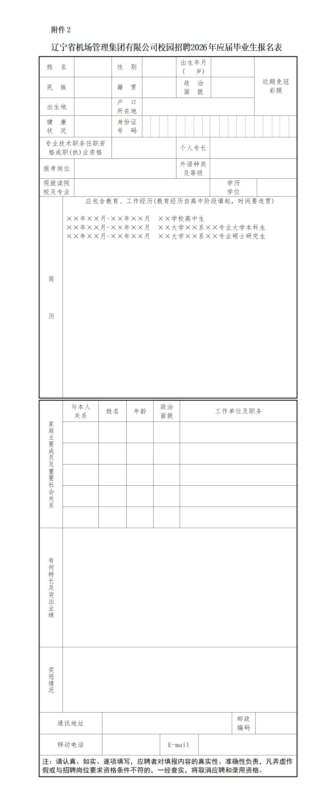 附件2:辽宁省机场管理集团有限公司校园招聘2026年应届毕业生报名表.doc