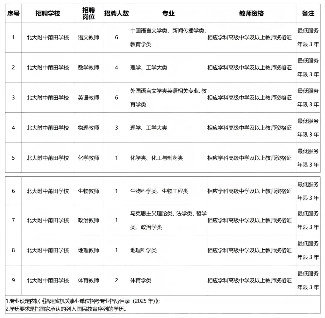 北京大学附属中学莆田学校(简称北大附中莆田学校)是北京大学附属中学(简称北大附中)教育集团直属分校、福建省莆田市市直公办学校。为满足学校发展与教育教学需要,拟公开招聘25名新任教师。具体方案如下:
