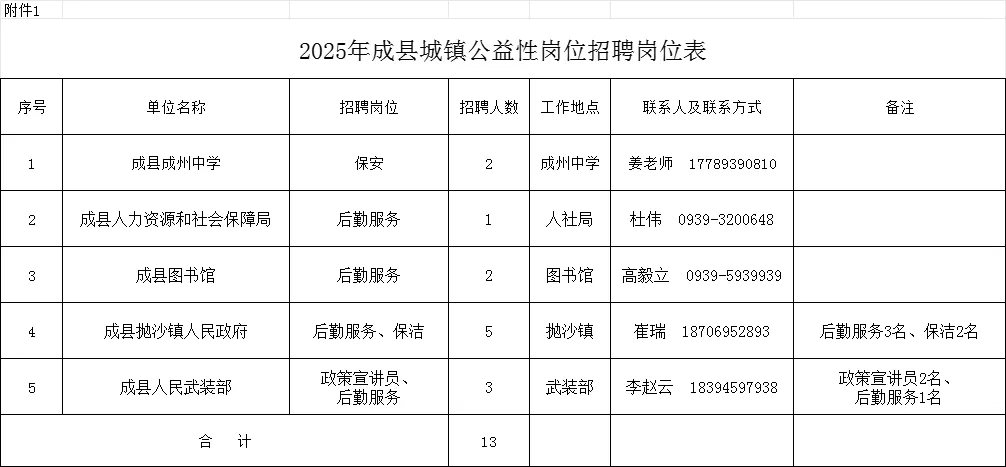 附:《2025年成县城镇公益性岗位招聘岗位表》