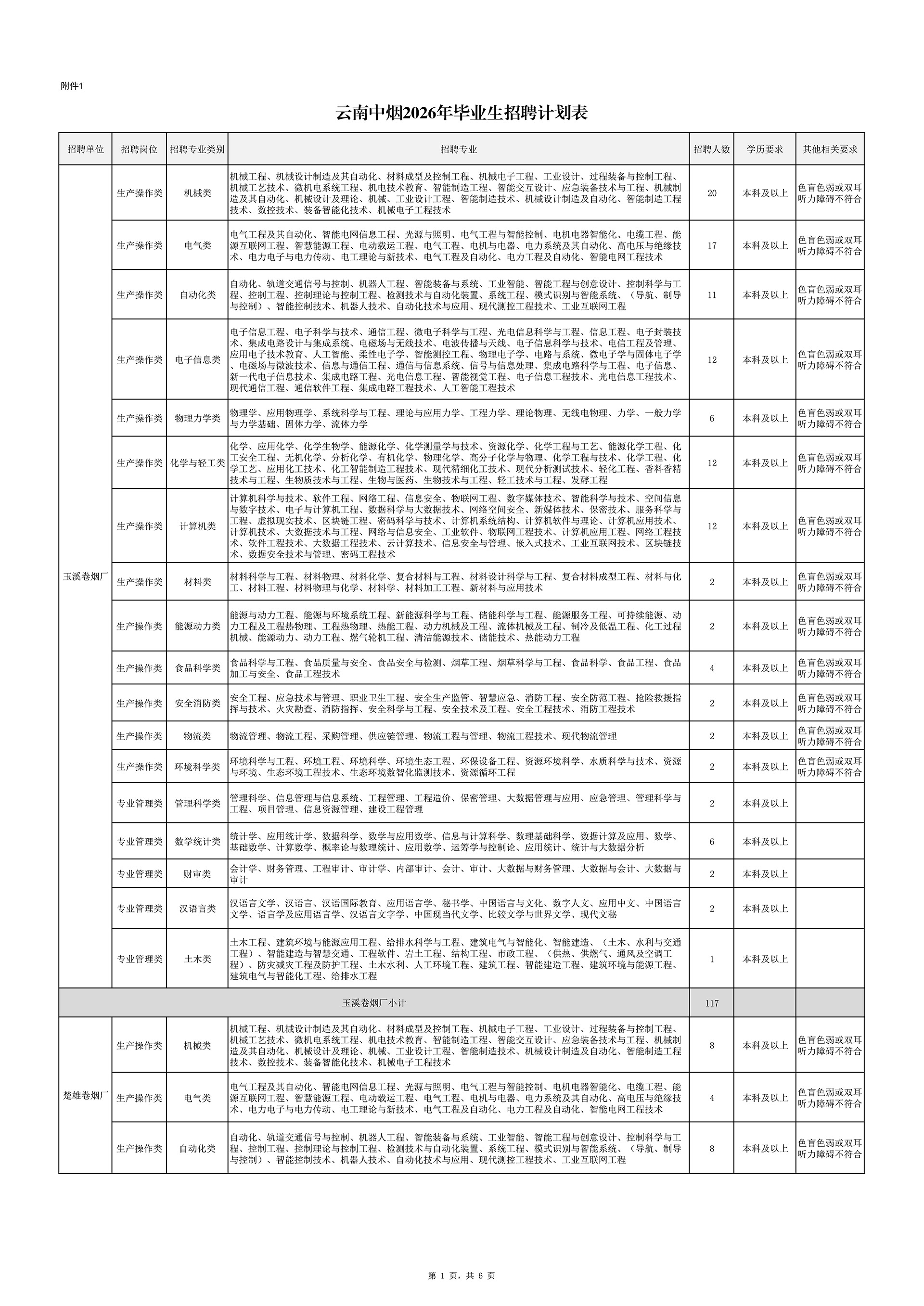 具体招聘单位、岗位、专业、学历等详见《云南中烟2026年毕业生招聘计划表》(附件1)。招聘岗位要求的学历、专业条件指应聘人员已(拟)获得的最高学历及所对应的专业。其中,已毕业人员最高学历为其已获得的学历,暂未毕业人员最高学历为其拟获得的学历。