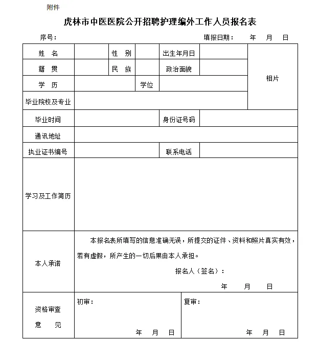 报名材料:请携带本人身份证、毕业证书(学信网认证报告)、护士执业证书或考试合格证明(所有证书原件需配复印件一份)、近期一寸免冠照片两张。同时如实填写《虎林市中医医院招聘报名表》(可现场领取)。