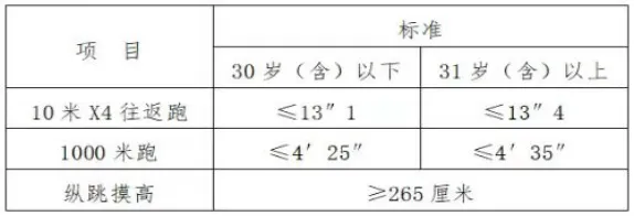 2.体能测评:司法辅助岗(02)需开展体能测试,体能测评采取达标制。标准按照《公安机关录用人民警察体能测评项目和标准》执行。其中男子1000米跑项目测评次数为1次,10米×4往返跑项目测评次数为不超过2次,纵跳摸高的测评次数为不超过3次。