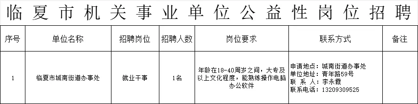 为促进就业困难人员就业,充分发挥公益性岗位托底安置作用,根据州人社局、州财政局《关于印发临夏州公益性岗位开发管理工作实施细则的通知》(临州人社通〔2020〕105号)等有关文件规定及工作需要,现面向社会公开招聘城镇公益性岗位人员。