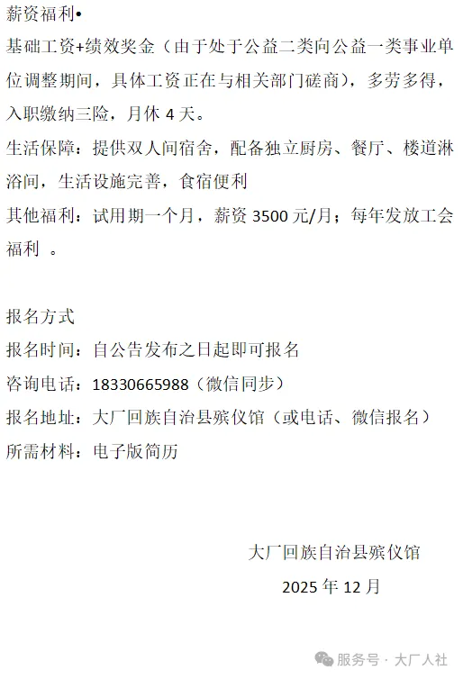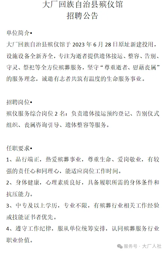 原始标题:招聘|大厂回族自治县殡仪馆招聘公告