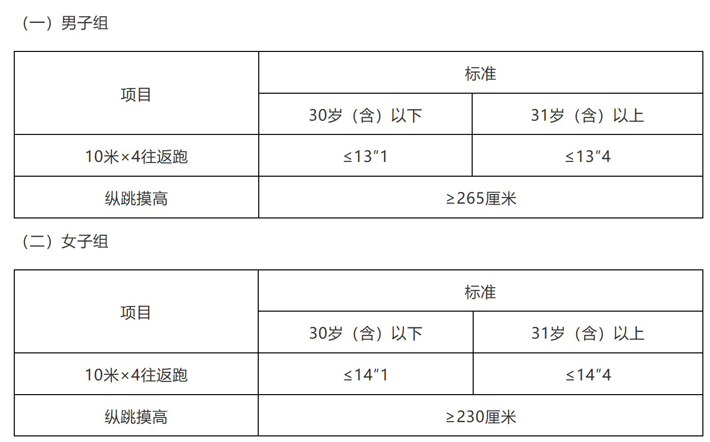 备注:10米×4往返跑每人最多可测2次,1次测评达标即视为该项目测评合格;纵跳摸高每人最多可测3次,1次测试达标即视为该项目测试合格。