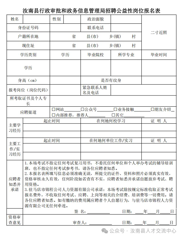 附件:汝南县行政审批和政务信息管理局招聘公益性岗位报名表
