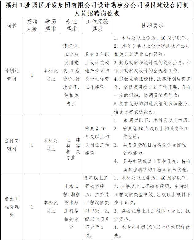 福州工业园区开发集团有限公司勘察设计分公司是福州工业园区开发集团有限公司于2025年新成立的分支机构,专注于勘察与设计相关业务,拥有工程设计建筑行业(建筑工程)甲级资质、工程勘察岩土工程专业(岩土工程勘察)乙级资质,因业务发展需要,公开招聘如下项目建设合同制岗位(详见招聘岗位表附件1),现将有关事项公告如下: