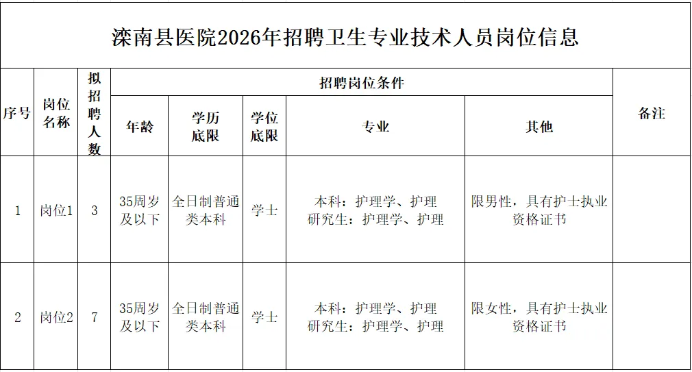 2026年1月6日起在滦南县医院公众号发布招聘公告。