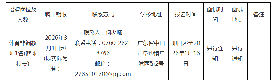 中山市阜沙镇第一幼儿园位于阜沙镇阜港西路2号,现有10个教学班,幼儿350人,教职工48人。因工作需要,现面向社会招聘体育非编教师1名(篮球特长)。具体情况如下: