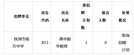 根据《2026年株洲市教育局直属学校面向高校毕业生公开招聘教师公告》,2025年12月26日至2026年1月6日进行了网上报名和资格初审。因1个岗位无人报名未能开考,经研究,现对此岗位作取消岗位招聘计划处理(详见下表)。