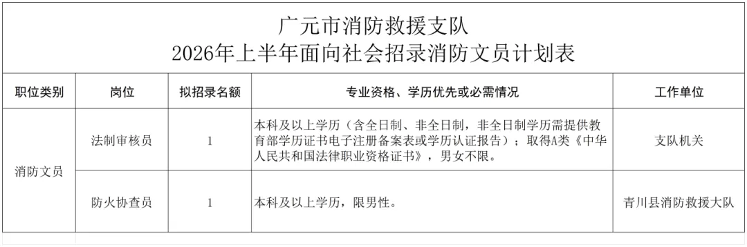 2026年上半年面向社会招录消防文员计划表
