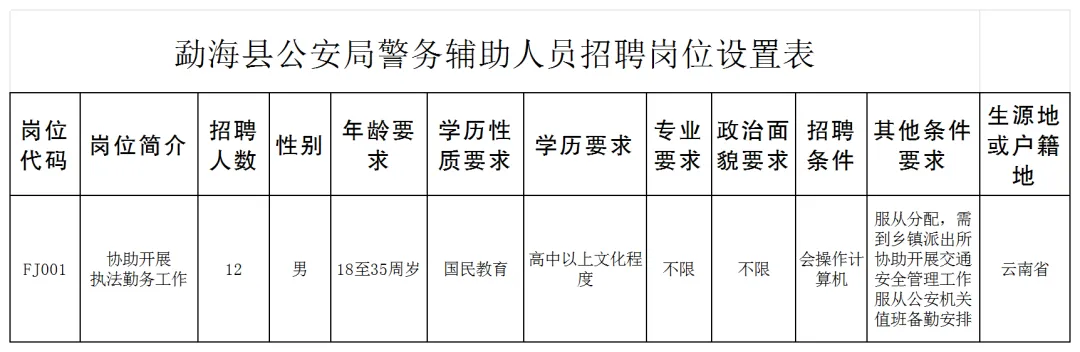 本次共招聘辅警12人,主要在勐海县公安局协助开展执法勤务工作等工作。辅警不具有人民警察和公务员身份,不行使人民警察职权。具体岗位见《勐海县公安局警务辅助人员招聘岗位设置表》