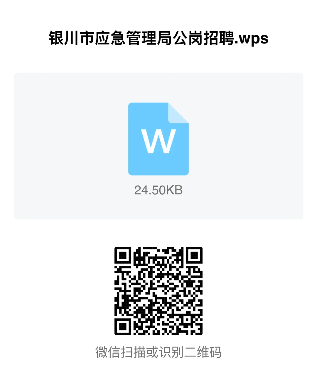 2.报名所需资料:本人身份证、毕业证、户口本、近期正面一寸彩色免冠证件照片、银川市应急管理局公岗招聘表(扫下方二维码获取)。