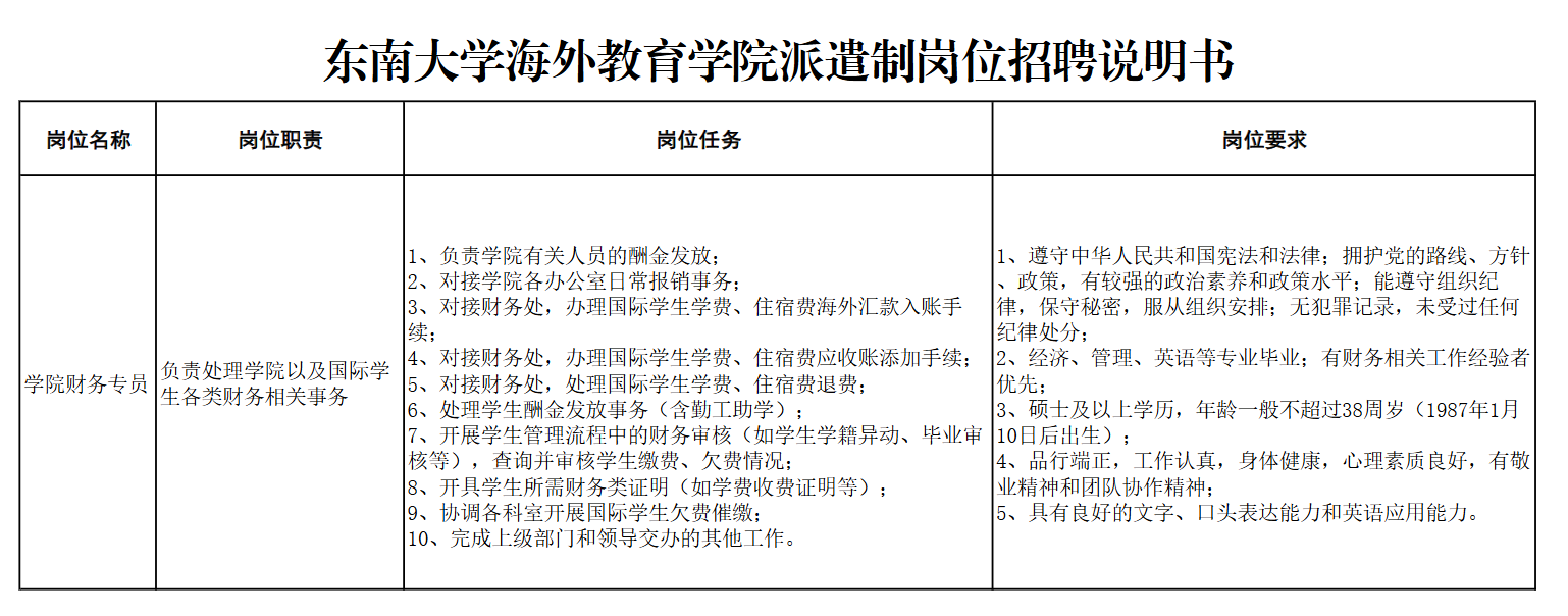 具体岗位任务和岗位要求详见《东南大学海外教育学院派遣制岗位说明书》。