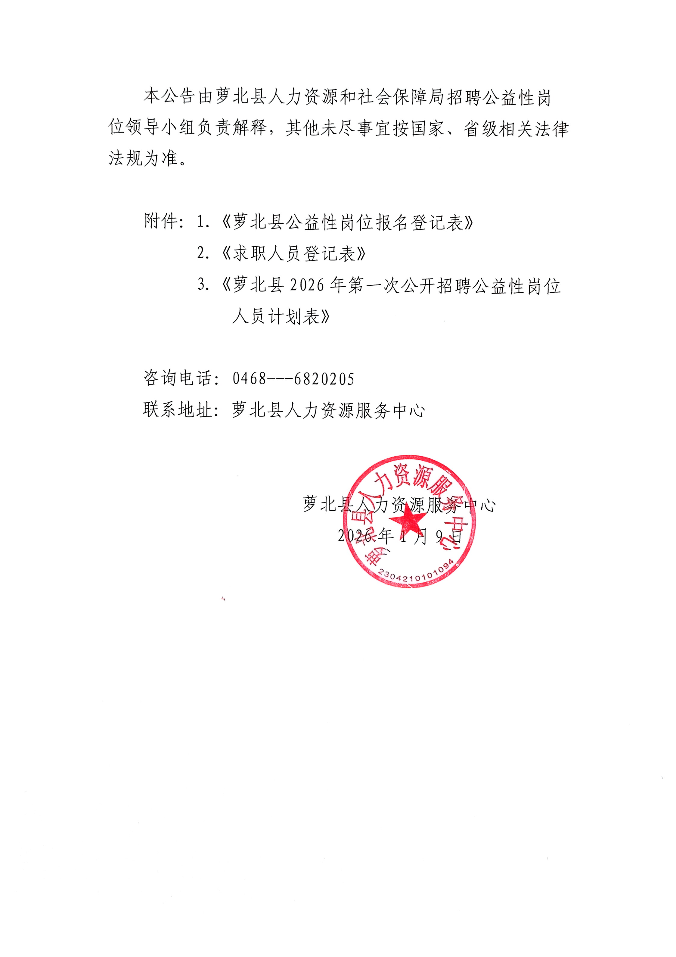 原始标题:萝北县2026年第一次公开招聘公益性岗位人员公告_鹤岗市萝北县人民政府