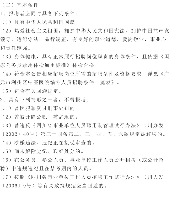 (一)资格审查工作由利州区中医医院人事科负责,资格审查贯穿全过程。应聘人员所提供的各项证件、资料须真实准确,若发现存在提供虚假信息或个人情况不符合招聘岗位条件的,立即取消其应聘资格。