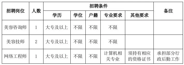 5、美容咨询师、网络工程师岗位年龄40周岁以下(1985年1月19日以后出生),美容技师岗位年35周岁(1990年1月19日以后出生)。