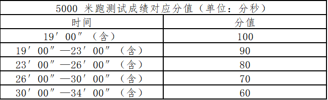 具体时间、地点、要求以《体能测试通知单》为准,考试项目为5000米长跑,满分为100分。