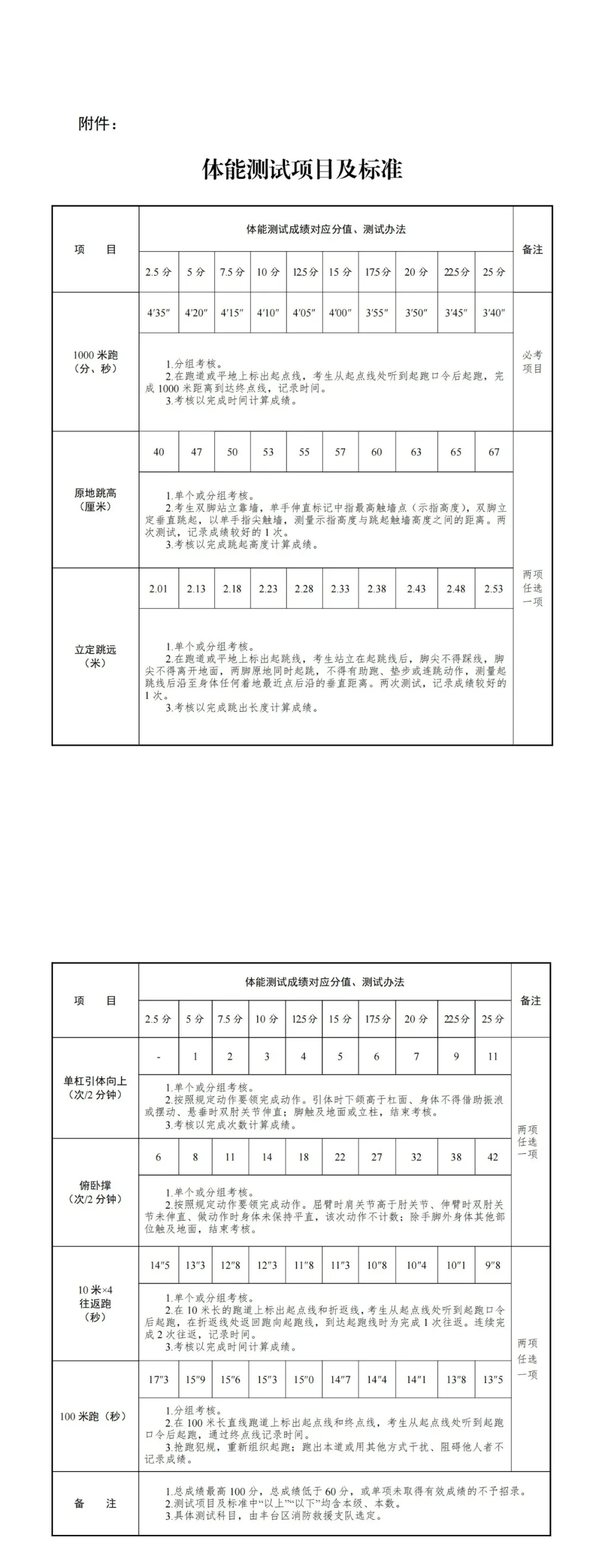(二)体、技能考核。在规定的时间地点统一组织实施(时间地点另行通知),灭火救援岗位体能考核为共同科目,考核科目为1000米跑,立定跳远,2分钟俯卧撑,10米X4往返跑(体能测试项目及标准见附件);战勤保障岗位技能考核由单位需求部门制定考核方案和内容,需求部门成立考核组对应聘人员采取线下实操方式开展考核。