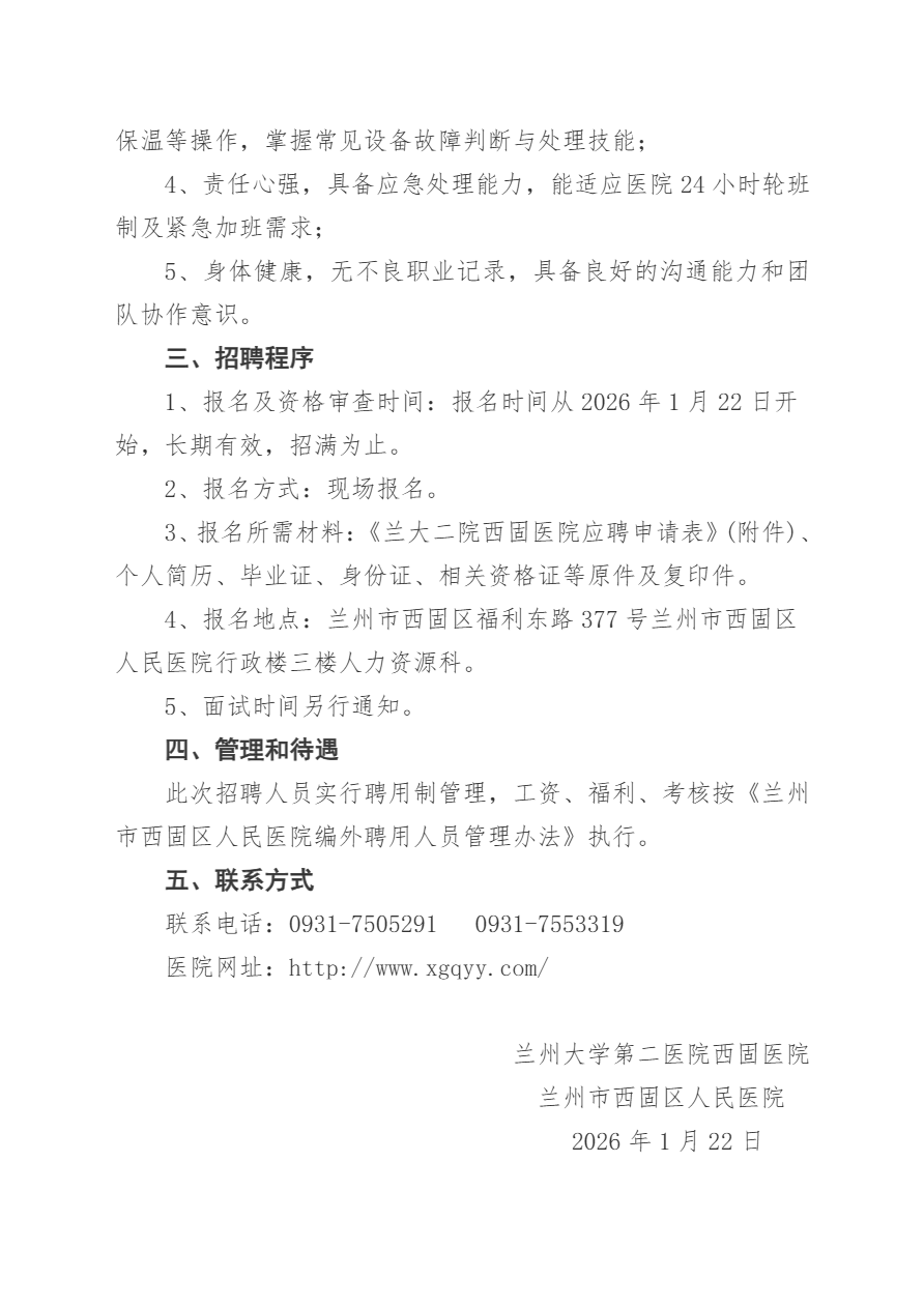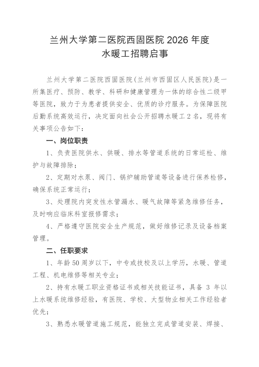 原始标题:兰州大学第二医院西固医院2026年度水暖工招聘启事
