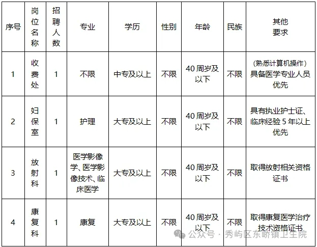 原标题:秀屿区东峤镇卫生院编外人员招聘的公告
