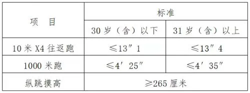 2.辅警体能测评采取达标制,按照中共中央组织部办公厅、公安部办公厅关于印发《公安机关录用人民警察体能测评项目和标准》的通知(公政治〔2024〕60号)执行,具体科目为“10米×4”往返跑、1000米(男)/800米(女)跑和纵跳摸高三项。