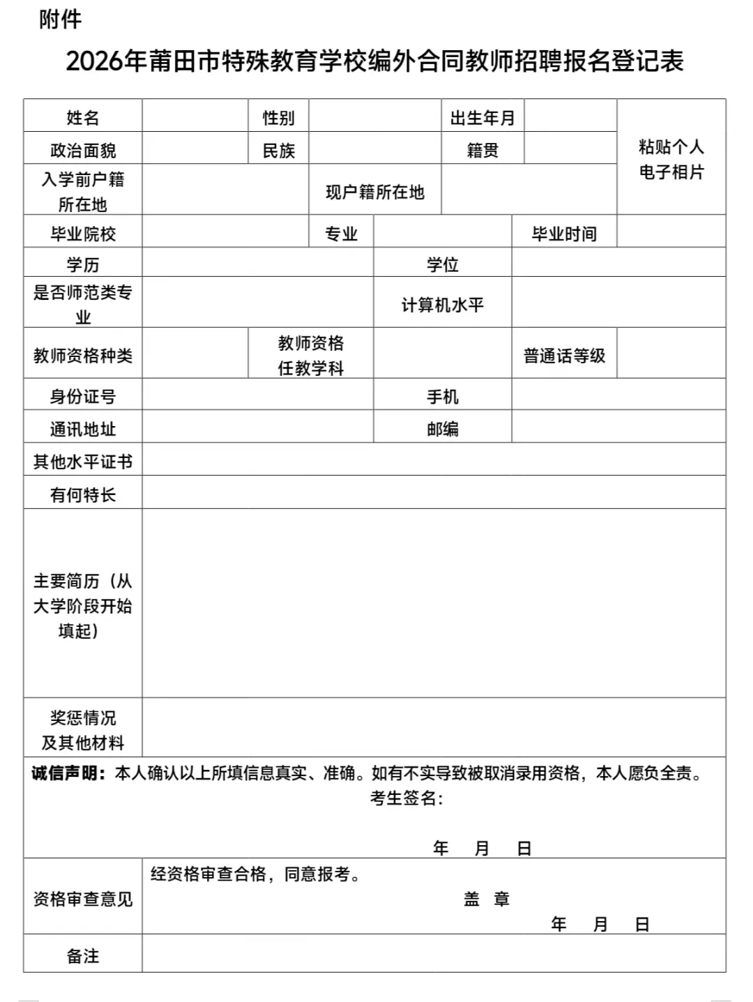 以电子邮件报名方式进行,符合岗位条件的应聘人员须提供《2026年莆田市特殊教育学校编外合同教师招聘报名登记表》(见附件),身份证、毕业证、教师资格证书、普通话等级证书的原件扫描件,报名邮箱:pttjbgs3992193@163.com。