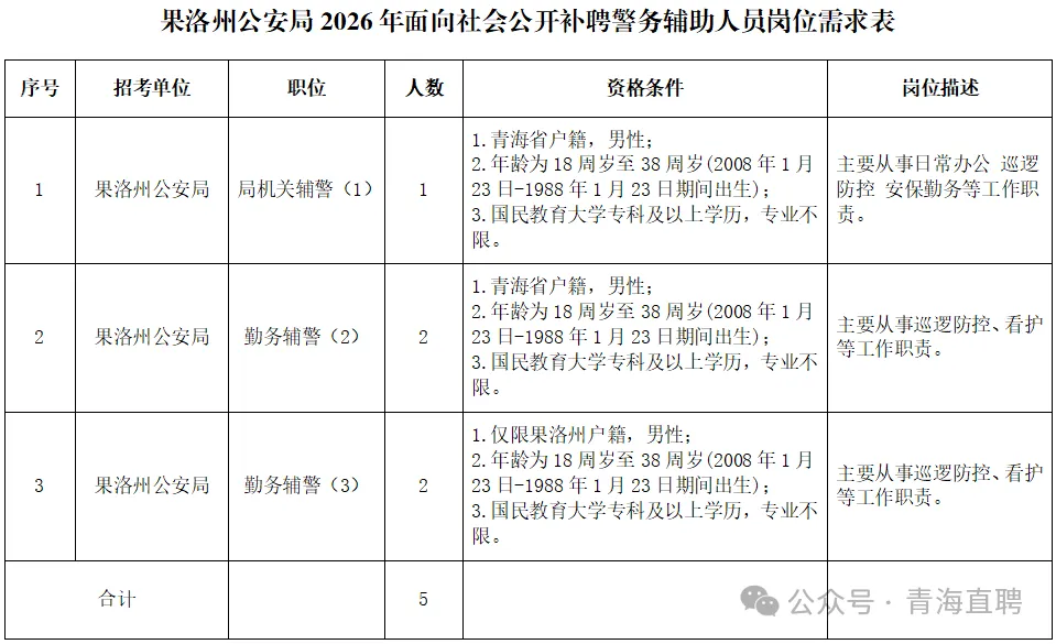 原始标题:果洛州公安局2026年面向社会公开补聘警务辅助人员公告