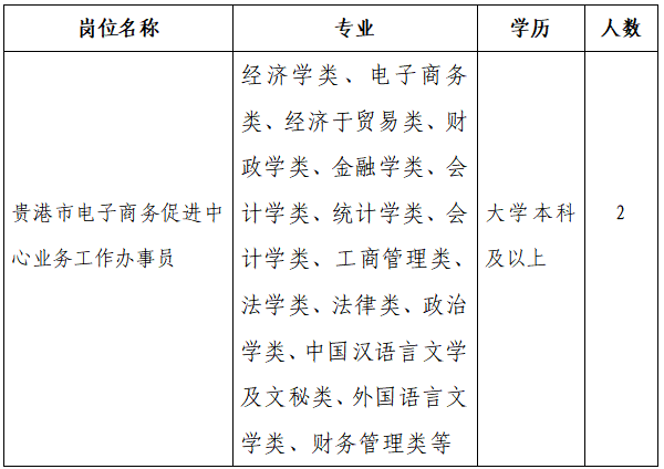 (三)报名方式:(1)网上报名。请报名者将相关材料扫描或拍照(面试时带原件核验)发送到电子邮箱:ggswj866@163.com,材料名称统一以“所报岗位名称+本人姓名”形式标注。(2)现场报名。请报名者携带相关材料到贵港市商务局3楼302办公室报名。(联系电话:0775—2933681)