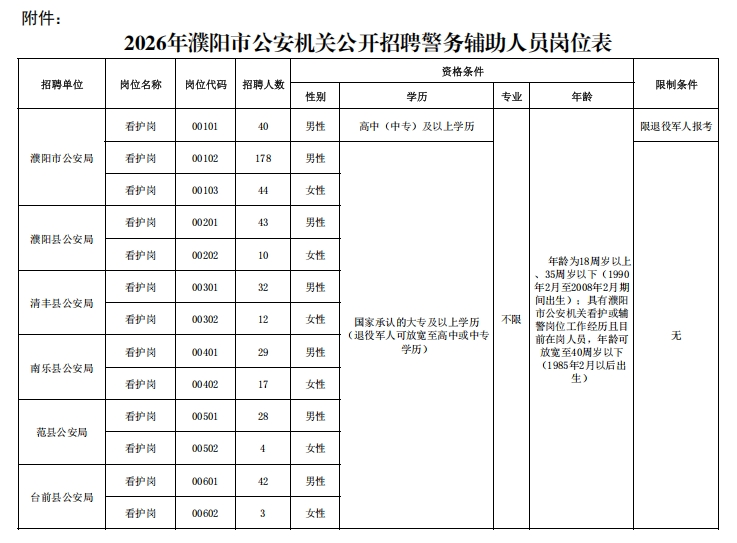 附件:2026年濮阳市公安机关公开招聘警务辅助人员岗位表