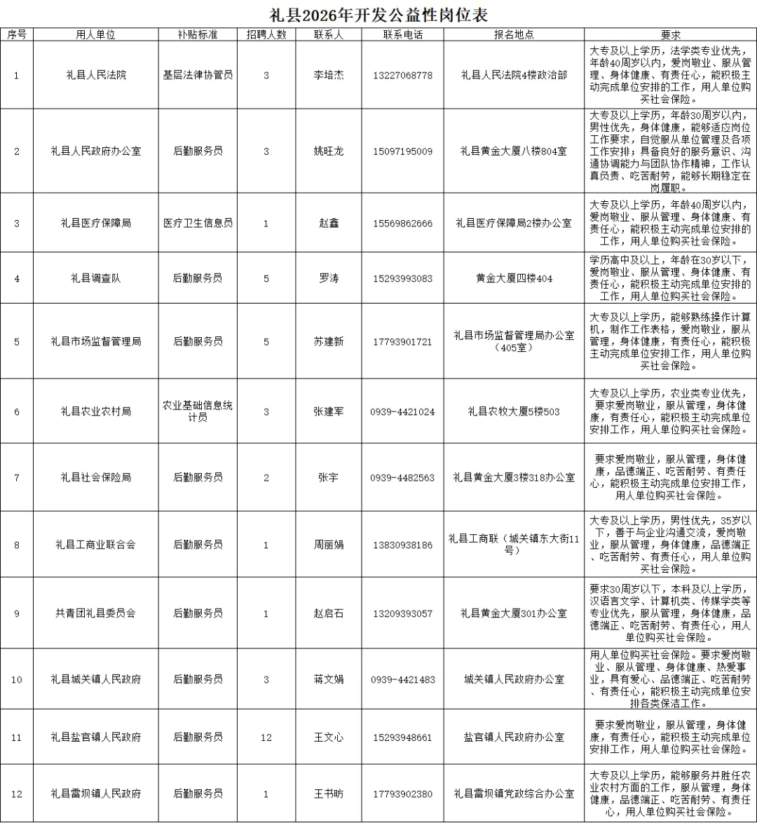 为促进全县就业困难人员充分就业,搭建供需双方对接平台,根据《关于进一步加强和规范公益性岗位开发管理工作的通知》(甘人社通〔2020〕126号)、《关于进一步规范公益性岗位开发管理工作的通知》(陇人社发〔2023〕300号),结合礼县人民法院等12家有关单位公益性岗位申请情况,现将2026年第一批公益性岗位招聘信息公告如下: