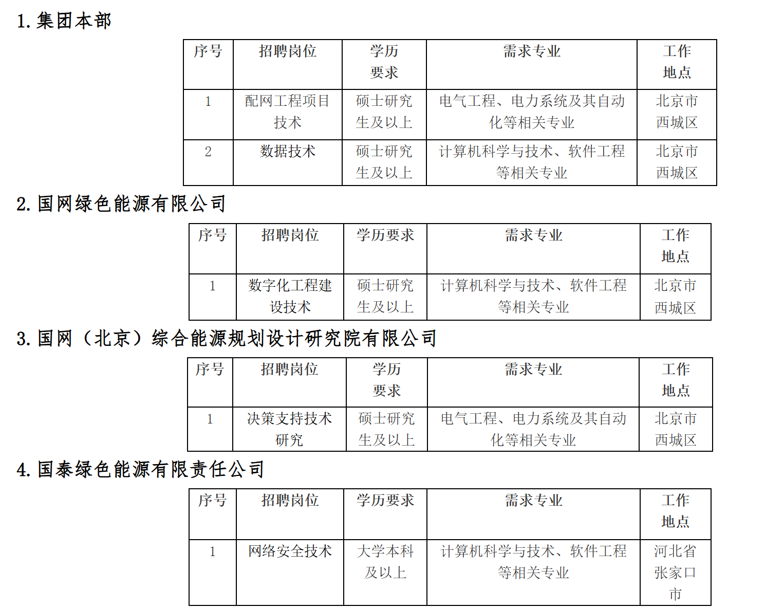 (2)集团京外单位国泰绿色能源有限责任公司的工作地点在河北省张家口市,应聘的毕业生必须具有大学本科及以上学历。