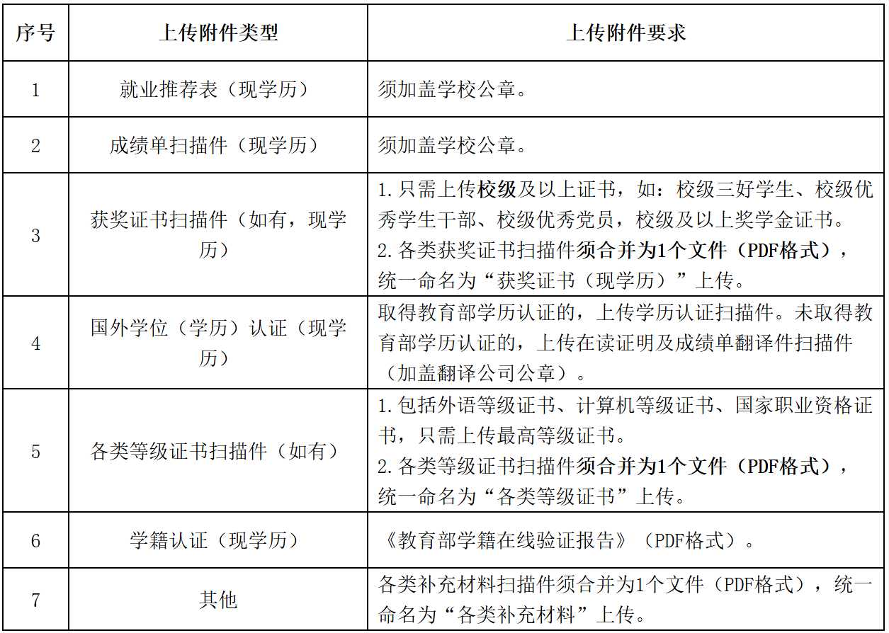 (一)应聘毕业生应认真阅读应聘条件,按照要求在网上填写报名信息,应确保所填信息完整、准确、真实。应聘毕业生应通过招聘平台及时、规范上传个人应聘附件材料,附件材料文档数量一般不超过7个,应确保应聘材料能正常打开、清晰显示,因应聘材料不能正常打开、图像不清晰或未按规范要求上传必需材料且影响简历筛选判断或材料真实性存疑的,将影响简历筛选结果。上传附件具体要求如下: