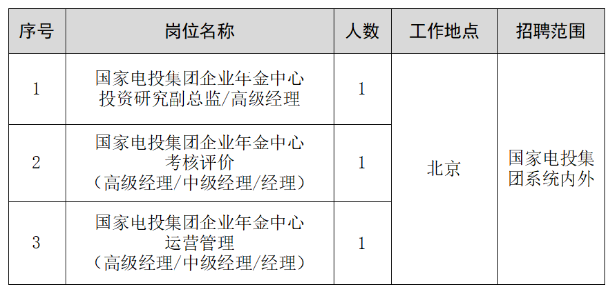 国家电投集团企业年金中心是国家电投集团服务保障中心,总部部门级,是国家电投集团企业年金日常运营主体、年金管理服务和考核监督平台。现根据工作需要,面向国家电投集团系统内、外公开招聘3个岗位,共计3人,具体事项公告如下: