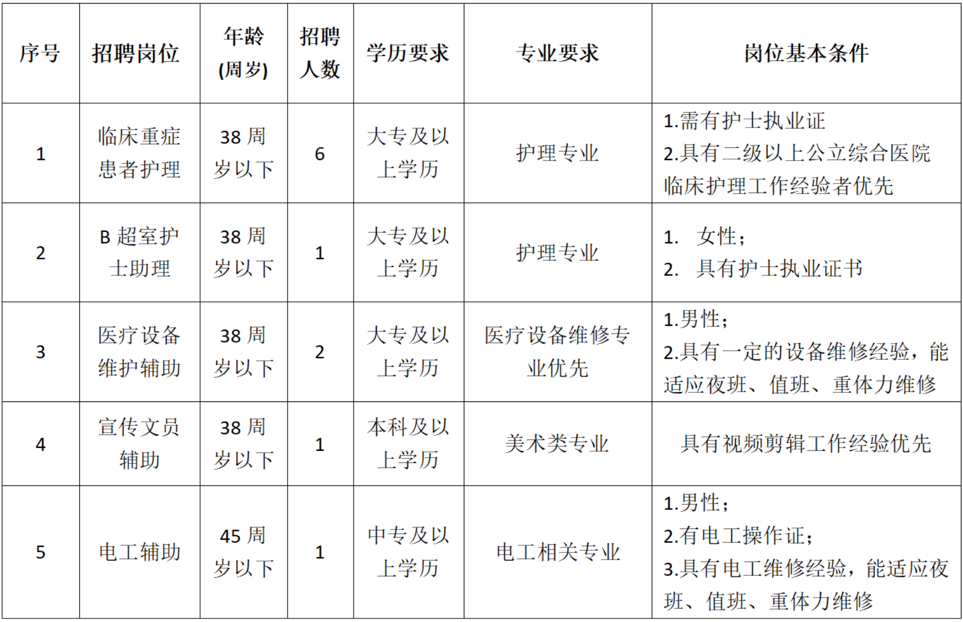 原标题:关于招聘驻医院医疗辅助、文员等岗位11人的公告