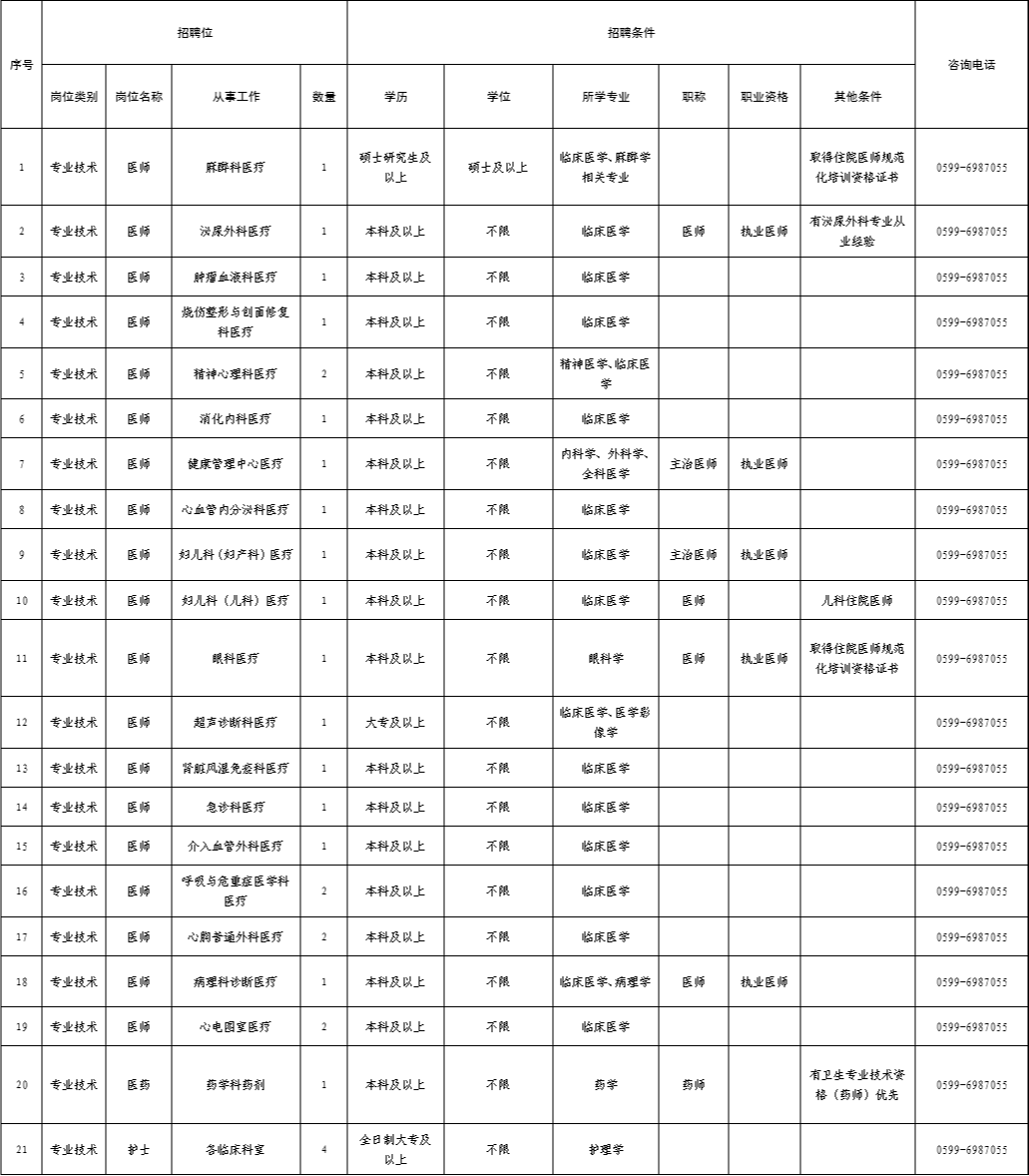 医院一季度拟招聘医疗、药学、护理等21个岗位,各岗位详细信息如下: