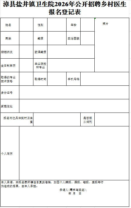 现场报名:漳县盐井镇卫生院综合楼二楼办公室。