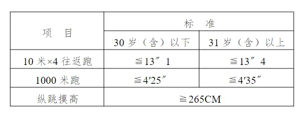 体能测评包括三个项目,分别为纵跳摸高、10米×4往返跑、1000米跑,每个项目测试次数不超过2次。体能测评采用达标制,任意一项不达标的,即为体能测评不合格,不进入下一环节。体能测评不设缓测、补测,达标标准详见下表。