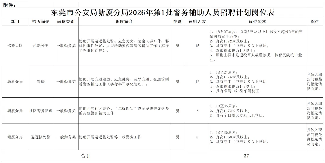 本次招聘人员为履行《广东省公安机关警务辅助人员管理办法》规定的辅助性警务职责的人员,不具有人民警察身份。招聘人员工作地点在东莞市(日常在塘厦镇),工作时间根据任务安排确定,需服从管理,能接受常态化体能训练、紧急召回、24小时值班备勤、轮值夜班、节假日值班、离莞出差、一线执勤、岗位调配等安排。本次招聘共设置4个岗位,计划招聘37人,具体招聘岗位、人数、资格条件等详见《东莞市公安局塘厦分局2026年第1批警务辅助人员招聘计划岗位表》(附件)。