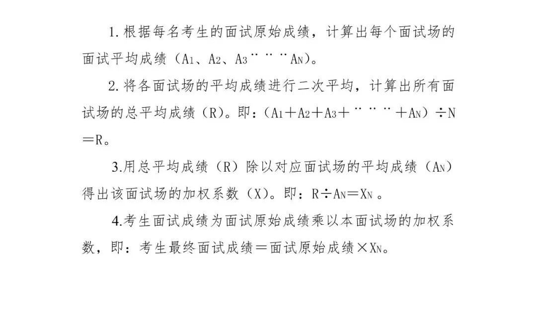 4.为确保面试成绩公平、公正,对同一职位、不同面试场报考人员的面试原始成绩,采用“二次平均法”进行平衡,平衡后的成绩为报考人员最终面试成绩。