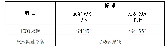 2.体能测试工作参照《公安机关录用人民警察体能测试项目和标准》实施,体能测试成绩现场公布。体能测试项目为1000米跑和原地纵跳摸高两个项目,均为达标项目,任一项不达标的取消招聘资格,具体标准如下: