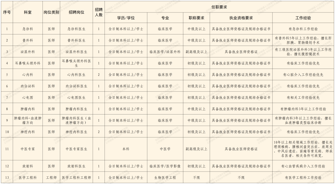 (二)招聘条件1、政治条件:拥护中国共产党的领导,热爱祖国,热爱军队医疗事业,遵纪守法,品行端正,无不良行为记录;2、身体条件:身心健康,外露体表无文身,言行举止得体,体检合格并能胜任本专业工作;3、学历条件:具有招聘岗位所要求的相应学历。全日制硕士及以上人员免笔试直接参加面试,并优先录取;4、资格条件:具有招聘岗位所要求的相应专业技术资格、执业资质。中级及以上职称、有规培证人员免笔试直接参加面试,并优先录取;5、年龄条件:除《招聘岗位》表内明确的详细条件外,应聘初级专业技术岗位,年龄不超过35周岁;应聘中级专业技术岗位,年龄不超过45周岁;应聘高级专业技术岗位,年龄不限。特别优秀的可适当放宽年龄要求。