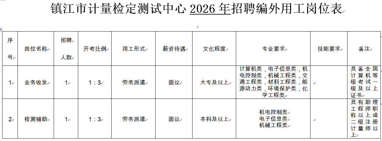 原标题:镇江市计量检定测试中心2026年编外用工招聘公告