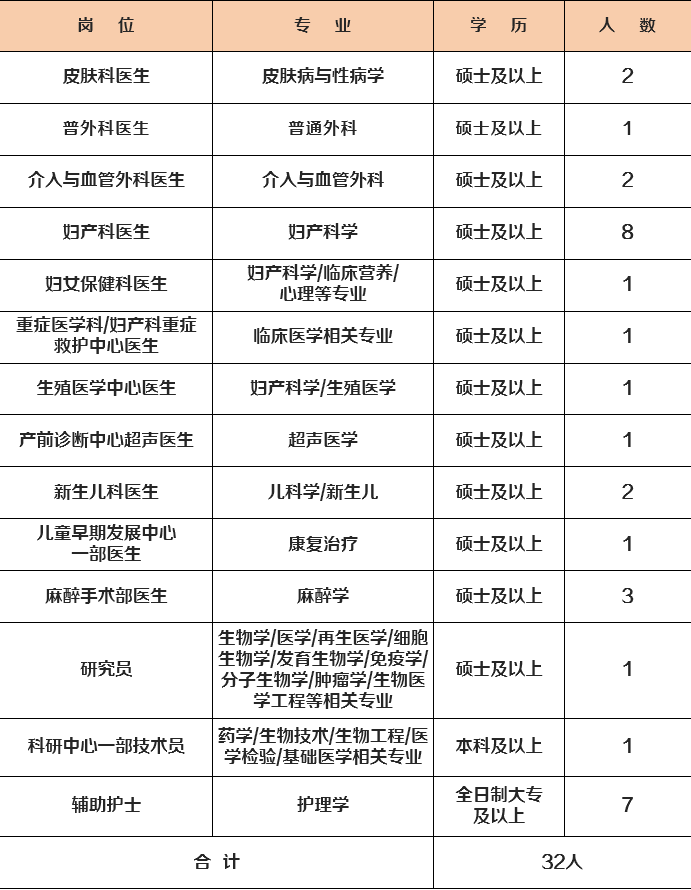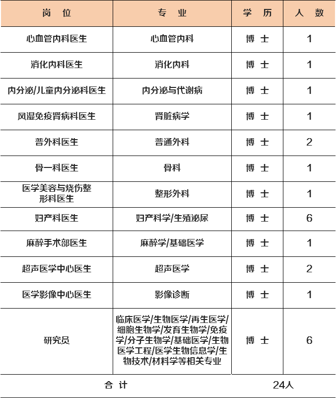 ②专业要求:临床医学学术学位博士,熟悉生物治疗技术,具有扎实的分子生物学基础、开发新型生物技术的潜力,并具有临床前研究的基本知识及能力;生物医学和基础医学博士,熟悉分子细胞生物技术,具有开发医学生物工程的潜力,具备生物技术临床转化的能力;信息技术博士,熟悉临床数据的挖掘、分析和应用,具备基于医学信息数据开发AI技术的能力,医学生物信息学专业优先。